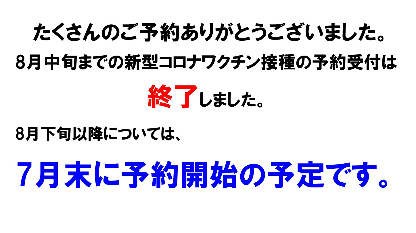 8月中旬までの新型コロナワクチン接種の予約受付は終了しました。